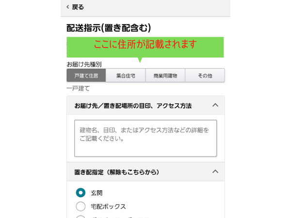 お届け先住所の項目に、「配送指示(置き配含む)」がある。