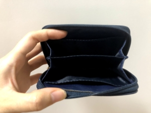 中にも2箇所カードを入れるのにちょうどいいポケットがついていて、チャックが大きく開くのでお金も取り出しやすくなっています。