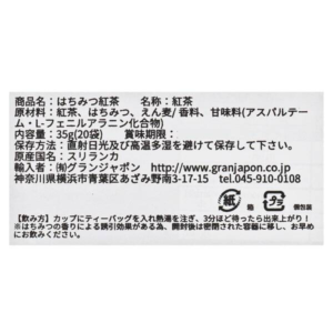 | 主原料 | 茶葉(紅茶) はちみつパウダー(粉末はちみつ・香料) 甘味料(アスパルテーム(L-フェニルアラニン含む) |