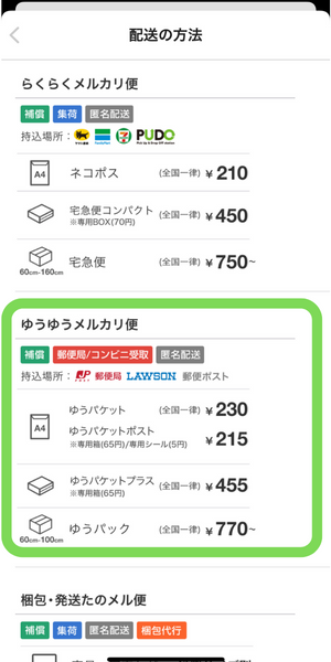 メルカリでは「ゆうゆうメルカリ便」「らくらくメルカリ便」の他にも配送方法を選択することができます。
