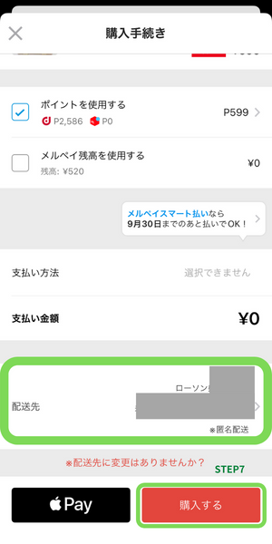 配送先が指定の場所に変更になったことを確認後、「購入する」をタップ。