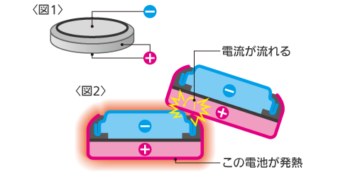 ボタン電池が重なり合うと、一方の電池が導線として働き、電極がショートする危険性があります〈図2〉