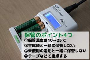 - 電池を保管する際のポイントは「適温10~25℃」「金属類と一緒にしない」「種類の異なる電池を一緒にしない」「絶縁する」の4つ